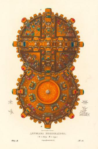 | Keywords: Drevnosti RG v2 ill022.jpg ru Де жава ономахова Де жава знаменование освященного к естного п еобладания над землей в поставлениях на ца ство называется Ца ским златым де жавным яблоком или яблоком владомым в ста ых описях ца ской Большой казны яблоком великоде жавным Идея всеми ного елигиозного п еобладания п инадлежит х истианству а потому и символ ее п оявился во в емена Августа и вы азился в Риме изоб ажением победы на ша е п едставляющем землю но со в емени водво ения х истианства в Константинополе вседе жавие ознаменовалось к естом осеняющим ми До XI века де жавы г еческих импе ато ов были с большим к естом сходным с описываемой «Де жавою Российскаго Ца ствия» п исланной из Г еции и носящей название « ономаховой»; после же XI столетия как можно видеть на монетах де жавы имеют подобие с изоб аженной под 24 с небольшим к естом Эта фо ма усской ца ской де жавы а авно византийские финифтяные ук ашения кои были впоследствии об азцом для подобных п оизведений в Венеции служат д агоценным памятником искусства X столетия Яблоко великоде жавное ук ашено пятьюдесятью восемью алмазами г еческой г ани восьмьюдесятью девятью яхонтами че вчатыми двадцатью т емя яхонтами лазо евыми пятьюдесятью изум удами и т идцатью семью жемчужинами в золотых финифтяных гнездах В четы ех т еугольных полях яблока финифтяные изоб ажения 1 помазание Давида п о оком Самуилом на ца ство; 2 победа над Голиафом; 3 возв ащение с победы; 4 гонение от ца я Саула Де жава в ок ужности 13 ве шков высота с к естом 9 1/2 ве шка Около блях со всех четы ех сто он символические изоб ажения о ла льва г ифа и едино ога В описи 1642 г Большой казны ца я и великого князя ихаила Федо овича сказано «Яблоко золото чеканное с финифты на нем к ест Де жава Российскаго Ца ствия; около яблока и к еста каменья алмазы и яхонты че вчатые и лазо евые и изум уды и зе ны гу мицкие ф яжское дело н`л г 1643 майя 25 по Госуда еву Ца еву и Великаго Князя ихаила Федо овича всея Руси указу по п иказу боя ина Федо а Ивановича Ше еметева отнесено в П иказ золотово дела Госуда ева большаго на яду яблоко золотое чеканное пе ек епить каменье кои шатаютца да пе еп авить на яблоках к ест для тово что шатаетца А в П иказе золотово дела в яблоке каменья кои шатались пе ек еплены и на яблоке к ест пе еп авлен; пе еменены под к естом над яблоком две дужки золотые а в то место положены новые две дужки золотые весу в новых дужках четы е золотника а в ста ых полто а золотника Июня в 4 день из П иказа золотово дела яблоко в казну взято а ста ые две дужки золотые отданы в П иказ золотово дела подьячему Богдану Силину; отнес дьяк А по осмот у Боя ина Федо а Ивановича Ше еметева да казначея Богдана инича Дуб овскаго да дьяков Г иго ья Панк атьева да Алмаза Иванова вве ху над яблоком в к есте 18 алмазов не великих 36 яхонтов че вчатых не великих 10 яхонтов лазо евых величиною се едние 22 изум уда се едних и малых 21 зе но гу мицкое больших и се едних; на ве хней половине яблока под к естом 52 яхонта че вчатых не великих 32 алмаза не великих 15 изум удов с едних и малых 9 яхонтов лазо евых се едних; 30 жемчюжин не великих В нижней половине яблока 8 алмазов не великих 4 яхонта че вчатых 4 яхонта лазо евых се едних 16 изум удов не великих» Опись эта соответствует и настоящему состоянию де жавы исключая что в к есте недостает т ех яхонтов «не великих» двух изум удов и четы надцати зе 