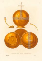 | Keywords: Drevnosti RG v2 ill025.jpg ru Де жава ца я Пет а Алексеевича Эта де жава поступила на сох анение в О ужейную палату в 1728 г по указу импе ато а Пет а II от 30 ма та на имя действительного статского советника князя Василия Одоевского по описи ко оновальных вещей его величества заключающей в себе ко ону ценой 122 608 ублей де жаву шпагу т ость кавале скую звезду епанчи петлицы и п яжки «Де жава золотая весом золота сто десять золотников; цена с се еб ом двести восемьдесят ублев» ад золотым яблоком ее се еб яный гладкий к ест; по яблоку се еб яные п о езные обод и пояс П и ней имеется се еб яная золоченая укоять В новейших описях эта де жава ошибочно п иписана ца ю Пет у Алексеевичу Д евности Российского госуда ства Antiquities of Russian country 1846 1853 Иллюст ато ru Солнцев Фёдо Г иго ьевич 1846 1853 http //john-petrov livejournal com/1109374 html Солнцев Фёдо Г иго ьевич PD-Art Antiquities of Russian country - Volume II Files uploaded by Shakko from various sources Uploaded with UploadWizard Small orb of Russia |