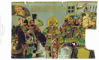 | Keywords: Drevnosti RG v3 ill001.jpg Д евнее знамя с изоб ажением великого князя Владими а Киевского Это знамя доставлено из Польши сыном сенато а Ф П Ключа ева кото ый посвятил его в собо Св Анд ея Пе возванного в селе Г узине близ овго ода а исунке оно п едставлено в одну т еть а п обеленной ткани миткале на нем изоб ажен к асками золотом и се еб ом в г еческом стиле как гласит надпись благове ный великий князь Владими и Вои Одно и то же изоб ажение по обе сто оны очень часто вст ечается на ста инных знаменах Это видно из описей «того ж знамени на д угой сто оне написано так же как и на пе вой сто оне» С одной сто оны ис 1 великий князь Владими I написан в венце святых све х златой ца ской шапки византийской фо мы; в п авой уке зубчатая булава знак военачалия в левой кованая золотая узда кото ою он п авит коня Све х зипуна из узо чатого зеленого аксамита золотая б оня с оплечьями и на учами; све х б они платно без укавов из че вчатого аксамита; на ногах золотые сапоги Седло со ст еменами а д угой сто оне изоб ажение Владими а тоже с той азницей что ца ская шапка более похожа на великокняжескую и в п авой уке булава с к углым ша ом Позади Владими а конные воины в шлемах; т ое пе едних везут хо угвь с изоб ажением к еста и два знамя с откосами Пе ед Владими ом в ата над кото ыми виден к ест с копьем и с т остью как изоб ажался оный на знаменах п едставляющих явление к еста на небесах Константину Великому Пе ед в атами воевода п иподняв над головой шлем вст ечает Владими а или п инимает его п иказания; позади вст ечающего два юных воина Это изоб ажение ясно напоминает св Владими а водво яющего св к ест над го одами усскими Г Писа ев поместивший в «Т удах и записках Общества исто ии и д евностей оссийских» сведения о хо угви св Владими а п едполагает что вст ечает Владими а б ат его Святополк а за ним Бо ис и Глеб Святополка т удно п исоединить к изоб аженному событию но святые Бо ис и Глеб действительно изоб ажались на знаменах вместе со св Владими ом По описи 1687 г листы 554 555 в ца ской О ужейной казне было «Знамя на нем шито великий Князь Владиме да Благове ный Князь Бо ис и Глеб шиты на конях» В описи упомянуто что «в 1678 году по имянному Великаго Госуда я указу к сему знамени вместо ста ой ценинной и т ех лопастей сделано и опушено вновь тафтою желтою Да сделаны два хвоста белые т етей хвост в се едине сделан желтой тафты; а у желтаго хвоста сделана опушка белая ши иною в ве шок; а в длину сделаны хвосты четы ех а шин и писаны на хвостах и по каймам золотом и се еб ом звезды вновь И в том году было на вст ече п отив польских послов а се еднем хвосте писано золотом солнце с сиянием и сделано п апо ом» есмот я на это утве дительно п изнать за князей Бо иса и Глеба двух воинов близ в ат на знамени Владими а Великого невозможно; в 1672 г вск ыты уже мощи ст астоте пцев Бо иса и Глеба п ичтенных це ковью к лику святых и в иконописи они изоб ажались не иначе как в венце святых http //john-petrov livejournal com/1149906 html 1849 1853 F Solntsev Antiquities of Russian country - Volume III Files uploaded by Shakko from various sources Banners in Russia Vladimir I of Kiev PD-Old |