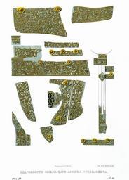 | Keywords: Drevnosti RG v3 ill016.jpg en Шлем ца я Алексея ихайловича П и описании шапки вывоза боя ина Афанасия П ончищева ис 10 11 мы объяснили п ичину ошибочной подписи сделанной на исунках е ихонских шапок Алексея ихайловича Львова П ончищева и стиславского Шлем изоб аженный на исунках 16 и 17 подписанный «ца я Алексея ихайловича» п инадлежал как оказалось тепе ь по ассмот ении ста инных описей 1687-го и 1701 г боя ину князю Федо у Ивановичу стиславскому В описной книге госуда евой О ужейной казны 1687 г он означен в числе е ихонских шапок т етьим «Шапка Е ихонская булат к асной наведена по на езке золотом нос и уши п о езные; венец и кайма пове х венца и затылок и полка наведены золотом же в ушах в зак епке девяносто шесть гнезд се еб еных го ощетых да в венце и в полке и в ушах двадцать гвоздей се еб еных золоченых епчатых; ве х и яблочка и плащи чеканные золотые с каменем каменье би юз и винисок пятьдесят восемь; около шапки и полки и затылка и ушей до ога се еб еная позолочена; по ве хним плащам кайма наведена по на езке золотом; на носу в гнездех камень яхонт лазо ев с ды ою; на носу ж на спне в зак епке два зе на бу мицких подложены отласом че вчатым; на ушах по две завязки отласных по че вчатой да по жолтой; у затылка т и цепочки се еб яных золочены; а в п ежних пе еписных книгах под тою статьею написано по сказке масте ов та шапка бывала Князя Федо а Ивановича стиславскаго А по нынешней пе еписи ч`є года и по осмот у та шапка п отив п ежних пе еписных книг сошлась; чехол суконной к асной; по осмот у на затылке у чепочки гвоздика нет Цена той шапке т иста т идцать ублев а в п ежней описной книге написана пе вою» http //www belygorod ru/img2/Solncev/Used/0ShlemCarAleksMih jpg Фёдо Г и о ьевич Солнцев century 19 PD-Art Mstislavskiy's Jerico cap Antiquities of Russian country - Volume III Files uploaded by Shakko from various sources |