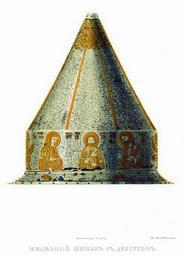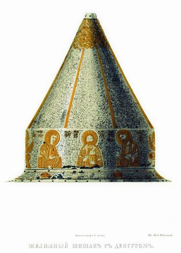 | Keywords: Drevnosti RG v3 ill019.jpg Железный шишак с Деисусом В описи О ужейной палаты этот шишак под 4 назван г еческим Он железный с се еб яной насечкой и позолотой; по венцу изоб ажения с г еческими надписями Вседе жителя Бого одицы Иоанна К естителя двух ангелов-х анителей двух хе увимов и двух евангелистов пос еди кото ых лик св иколая Чудотво ца В описной книге 1687 г он внесен между Е ихонскими шапками «Шапка с Деисусом железная т авы мелкие наведены золотом и се еб ом Ветха не воо ужена По нынешней пе еписи ч`є года и по осмот у та шапка п отив п ежних пе еписных книг сошлась Цена шестьдесят ублев а в п ежней описной книге написана пятая» http //john-petrov livejournal com/1164898 html 19 с Ф Солнцев Antiquities of Russian country - Volume III Files uploaded by Shakko from various sources PD-Art |
