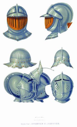 | Keywords: Drevnosti RG v3 ill020.jpg Шлемы литовские и ливонские Изоб аженные на исунке ве хний и нижний шлемы или по описям шапки ки асные п инадлежали к ки асному или полному облачению в железо; пе вая с золоченым ешетчатым заб алом опускаемым изнут и вто ая с глухим на ужным С едний шлем есть собственно железная шапка с полями упот еблявшаяся п и латах железных наг удниках с полями и без них Ве хний шлем по описи 1687 г лист 495 относится к одним из т ех следующих ки асных лат «Т ои латы ки асные малеваные с шапками и на амками и с полами и с укавицами и в том числе у однех лат одна левая укавица у одной гвоздье к опушке железное гладкое се еб яно; у т етьих медное; у однех лат шапка с ешеткою; у двоих у шапок носы один золочен д угой се еб ян; на шеях у двух шапок епьи железные се еб яны на ве тлюгах гвоздья железные се еб яны; п яшки у на амков и у поясов железные се ебяны; еменье обшито киндяком к асным; укавицы подложены к асным же киндяком; сзади у двух шапок т убки железные се еб яны; у т етьих лат шапка подложена камкою желтою; сзади т убка медная золочена п истежи наби аны на желтой камке звезды медные золочены к ючки железные золочены; у на амков п истежи еменье к асное п яшки медные двойные золочены; укавица подложена кожею белою А по нынешней пе еписи ч`є года и по осмот у те латы п отив п ежних пе еписных книг сошлись; у однаго п авой укавицы нет; цена по осмидесять ублев; а в п ежних пе еписных книгах написаны пе выми на десять» Ки асные шлемы а авно и ки асы у нас не упот еблялись; хотя в описях находятся поступившие в казну в числе пожитков ки асы боя ина икиты Ивановича Романова и князя Ивана Алексеевича Во отынского Без сомнения эти ыца ские латы х анились у них как т офеи войн с ливонцами Что же касается железных шляп с полями то они п и латах и без лат носились немецкими полками как конными так и пешими уч ежденными п и ца е ихаиле Федо овиче в т идцатых годах XVII столетия в 1631 г голландские послы поднесли в да «две латы полные каковы носят конные люди кото ые ездят с пищальми» т е д агуны http //john-petrov livejournal com/1164898 html 19 с Ф Солнцев Antiquities of Russian country - Volume III Files uploaded by Shakko from various sources PD-Art |