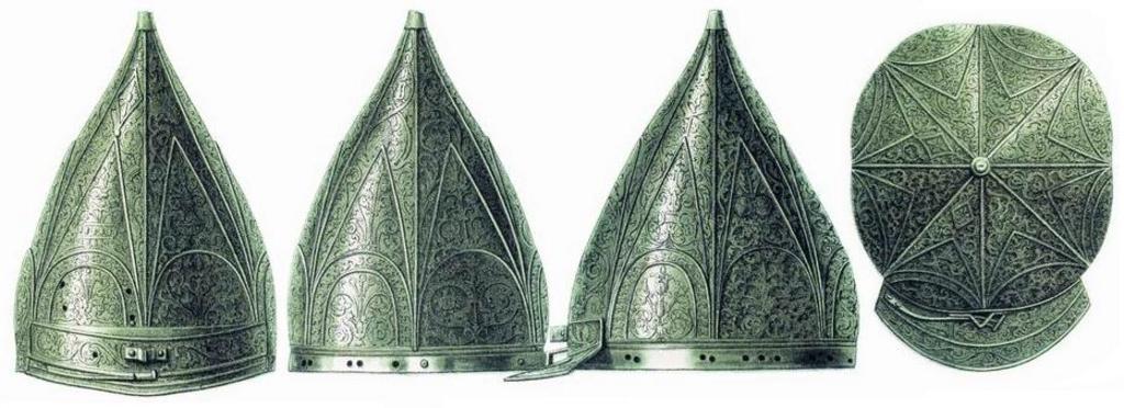 Keywords: Drevnosti RG v3 ill022a - Shelom Thekanny.jpg Чеканный шелом ауши и назатыльник ут ачены «Шолом чеканной г аненой; по венцу сплошь по половине к уга повыше к угов на г анях по клинцу; че ез к уг и че ез клинец и че ез г ань золочено; ветчан; наушки и затылок немецкаго железа пок ыты зеленым ба хатом; завязки отлас че вчат А по нынешней пе еписи ч`є года 1687 и по осмот у тот шолом п отив п ежних пе еписных книг сшолся; завязок нет; цена шестьдесят ублев а в п ежней описной книге написан пятой» Д евности Российского госуда ства < 1853 Солнцев Фёдо Г иго ьевич Author died more than 70 years ago - public domain PD-old Antiquities of Russian country - Volume III Shelom |