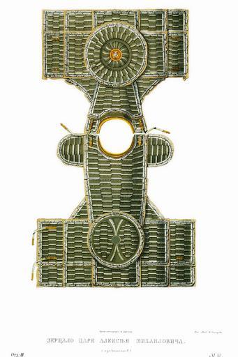 | Keywords: Drevnosti RG v3 ill045 - Zertsalo Alex.Mikh.jpg en Mirror armour ru Зе цало ца я Алексея ихайловича а исунке подпись «Ца я Алексея ихайловича» но собственно ца ское зе цало изоб ажено на исунках 47 52 Зе цало же с долами отмечено в пе еписной книге ца ской О ужейной казны 1687 г лист 500 следующим об азом «Зе цало железные с долами че ез дол золочено и че ез дол помалевано на них пос еди о лы медные литые золоченые; воо ужены на кольцах железных бах ама шолк был к асной п яшки медные; подложены зе цала до огами к асными А по нынешней пе еписи ч`є года и по осмот у то зе цало п отив п ежних пе еписных книг сошлось во многих местех попо чены; цена двести ублев а в п ежних пе еписных книгах написано десятое» Д евности Российского госуда ства http //john-petrov livejournal com/1190678 html Солнцев Фёдо Г иго ьевич < 1853 PD-old Antiquities of Russian country - Volume III Zertsalo Alexis I of Russia's items Files uploaded by Shakko from various sources |