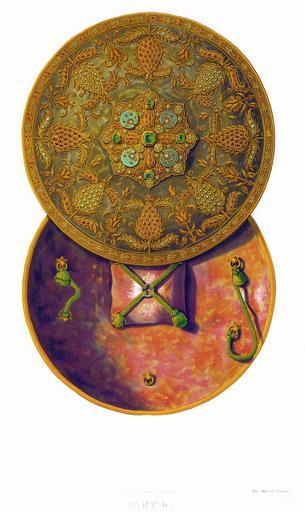 | Keywords: Drevnosti RG v3 ill065.jpg Щит Это также один из двух сове шенно одинаковых щитов х анящихся в О ужейной палате под 6 и 7 В описи 1687 г лист 191 ни описаны следующим об азом «Два щита шиты по алому ба хату волоченым золотом; на ве ху по большому плащу се еб еному в них по четы е яшмы к углых насечены золотом; в яшмах по пяти яхонтиковых че вчатых в том числе в двух яшмах по камешку нет и гнезда нет; одна яшма пе еломлена; в тех же яшмах по низаному епейку по семи зе ен жемчужных да в больших плащах по пяти каменев заби затов да около больших ве хних заби затов по четы е т авочки в них по семи иско ок да по семи т авочек маленьких в них по т и иско ки яхонтовых че вчатых да по осьми епьев се еб еных в них по семи би юзок; у однаго в двадцати четы ех гнездах по би юзке у д угова в двадцати ж в четы ех гнездех по яхонтовой иско ке че вчатых; на щиту по осьми плащей се еб еных золочены с каменьем; выше и ниже плащей по два звенца косых се еб еные ж с каменьем; в четы ех плащах в звенцах по двадцати по осьми иско ок яхонтовых да по четы надцати би юзок; в д угих четы ех же плащах и в звенцах по двадцати ж по осьми би юзок да по четы надцати иско ок яхонтовых че вчетых; около щитов венцы се еб еные золоченые езные; на венцах чеканены т авки по шти десять по одной т авке; в них в т идцати в одной т авке у д угова венца в т идцати т авках по т и иско ки яхонтовые че вчатые в т авке; да в т идцати в одной т авке да в т идцати ж т авках по т и би юзки в т авке; подложены и подушечка алой ба хат; п ивязка и воо уда столбец шолк зелен; по десяти колец с п обойцы и с епейками медные золочены одно колечко вы валось; щиты опушены один голуном золотным д угой се еб еным По записной книге написано «Великому Госуда ю челом уда ил Г еченин Ю ья Иванов во k`и году 1657 Цена по пятидесяти ублев» А по нынешней пе еписи ч`є года и по осмот у те щиты п отив п ежних пе еписных книг сошлись; цена тем щитам по пятидесяти ублев а в п ежней описной книге написаны во вто ой надесять статье» Д евности Российского госуда ства http //john-petrov livejournal com/1190678 html Солнцев Фёдо Г иго ьевич < 1853 PD-old Antiquities of Russian country - Volume III Files uploaded by Shakko from various sources |