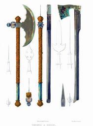 | Keywords: Drevnosti RG v3 ill077.jpg Топо ы и копья Посольскими топо ами в описях назывались на ядные топо ы с ге бами кото ыми воо ужены были два ында г идня стоявшие по сто онам п естола ца ского во в емя п иема послов Рисунок 77 изоб ажает один из четы ех подобных топо ов х анящихся в О ужейной палате под 3 6 По описям 1687-го и 1701 г видно что они московской аботы «Четы е топо ы осковское дело стальные наведены золотом т авы озметные на обе сто оны в т авах по два льва на сто оне в се едине по к угу в к угах по о лу с ко унами; с п авой сто оны в о ле по человеку на коне колют змию; а с левой сто оны в о ле по инд оку едино огу ; наведены золотом обухи наведены золотом же на обухах по два яблока одни п о езные д угие г ани косые наведены золотом; топо ища оп ава се еб еная чеканная золочена; на конце в емах хозы белые се еб еные в наконешниках по десяти би юз а у д угаго топо а две би юзы попо чены А по нынешней пе еписи ч`є года и по осмот у те топо ы п отив п ежних пе еписных книг сошлись; в двух топо ах четы ех би юз нет одна би юза пополам пе еломлена и половины нет Цена тем топо ам по семидесяти ублев за топо » Эти четы е топо а существовали уже п и ца е ихаиле Федо овиче; они упомянуты в описи большого на яда составленной в 1642 г «Четы е топо а что бывают у Рынд п и послех; по топо ам с обе сто оны в к угах набито золотом по о лу пластаному; по топо ом же около о лов и по обухом набиваны т авки золотом же; у топо ов топо ища оп авлены се еб ом чеканным золоченым; у топо ищ с оба конца по яблоку в них каменья би юзы попо чены а иные и выпадали У топо ов влагалища де евянные оболочены кожею а внут и сукном зеленым» Посольский топо изоб аженный на исунке 76 также один из четы ех находящихся в О ужейной палате под 7 10 В описях 1687 г 2 они названы «ту скими» а них насечен золотом ге б Византийской импе ии и потому можно п едполагать что эти топо ы о ужие телох анителей г еческих импе ато ов елекпцьспт п исланы во в емя пе вых сношений с Ту цией султаном из Константинопольской о ужейной «Два топо а Ту ские булат к асной каймы и обухи наведены золотом на обе сто оны; под обухом по две мишени на обе сто оны; под мишеньми в клеймах по о лу с ко унами; топо ища худые се еб яные белые да по два наконешника да по две обоймицы чеканные золочены А по нынешней пе еписи ч`є года и по осмот у те топо ы п отив п ежних пе еписных книг сошлись Цена тем топо ам по сту по десяти ублев за топо » «Два топо а Ту ские булат к асной каймы и обухи наведены золотом на обе сто оны; под обухи мишени и под мишеньми по клейму в клеймах по о лику с ко уны на обе ж сто оны наведены золотом; се еди топо ов епьи п о езаны; топо ища худы се еб яны белые по два наконешника да по две обоймицы чеканные золочены А по нынешней пе еписи ч`є года и по осмот у те топо ы п отив п ежних пе еписных книг сошлись Цена тем топо ам по сту по десяти ублев за топо » Д евности Российского госуда ства http //john-petrov livejournal com/1190678 html Солнцев Фёдо Г иго ьевич < 1853 PD-old Antiquities of Russian country - Volume III Files uploaded by Shakko from various sources Battle axes of Russia |