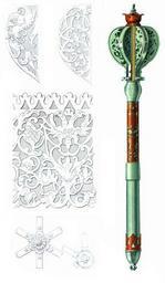 | Keywords: Drevnosti RG v3 ill081b - Shestopior.jpg Шестопё «Пе нат о шти пе ах на пе ье п о езаны т авы и поставлены в лице об учи вызолочены п иве нуты щу упами в об уче по т и щу упа железные; на ве ху ко уна с яблоком п о езным вызолочены а на ве ху яблока малинькие яблочки железные не золочены; под пе ьем яблоко с по езкою; в лице под яблоком п ием медной п о езной позолочен; посе едь яблока и от яблока укоятка г аненая позолочена; повыше исподнева яблока спуск медной п о езной позолочен и п иве нут одним щу упом; яблоко че ез г ань п о езано; под исподом яблока поставлено в лице с пуговкою пуговка сквозная» Д евности Российского госуда ства < 1853 Солнцев Фёдо Г иго ьевич Author died more than 70 years ago - public domain PD-old Antiquities of Russian country - Volume III Ceremonial maces Flanged maces Maces of Russia Pernach |