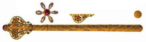 | Keywords: Drevnosti RG v3 ill084a - Shestopior.jpg Шестопё Пода ен Алексею ихаловичу в 1655 «Быздыган пе ья п о езные золотые с винивты в главе яхонт че вчет большой г аненой под ним десять изум удов; в пе ье сто восемь яхонтов че вчатых да т идцать шесть изум удов; че ен п о езной золот попо чен; исподняя т убка сходит; по я лыку написан тот быздыган шестопе ом; челом уда ил Великому Госуда ю тем быздыганом Г еченин Дмит ей Остафьев по k`г году июля в к`з день А по нынешней пе еписи ч`є года и по осмот у тот быздыган п отив п ежних пе еписных книг сшолся; цена тому быздыгану шестьсот пятьдесят ублев а по п ежней описной книге написан вто ым» Д евности Российского госуда ства < 1853 Солнцев Фёдо Г иго ьевич Author died more than 70 years ago - public domain PD-old Antiquities of Russian country - Volume III Ceremonial maces Flanged maces Maces of Russia Pernach |