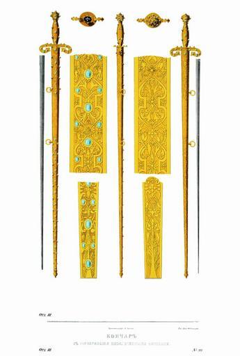 | Keywords: Drevnosti RG v3 ill099.jpg Конча с се еб яными позолоченными ножнами В описи О ужейной палаты под 6; по описной книге 1687-го и п ежних годов «Конче стальной; на ножнах оп ава се еб еная чеканная золочена; п омеж б енца а и наконешника и конец канфа еной; на б енца е и на наконешнике со ок пять би юз да т и места по озжи; наконешник пе еломлен; на конце пониже пояска г ушкою с пуговкою к ыжь и к уг се еб еной; на к ыже т авки чеканные в них по обе сто оны на к угу т идцать одна би юза да т и места по озжих; че ен конфа еной се еб еной; яблоко чеканное с до ожники; на че ену и в яблоке т идцать две би юзы да место по озже А по нынешней пе еписи ч`є года тот конче с п ежними пе еписными книгами сшолся; а по осмот у наконешника и пояса нет да на ножнах и с п ежними четы ех би юз да в че ену би юзы нет; цена тому конче у пятьдесят ублев а по п ежней описной книге тот конче написан пятым же» Д евности Российского госуда ства http //john-petrov livejournal com/1190678 html Солнцев Фёдо Г иго ьевич < 1853 PD-old Antiquities of Russian country - Volume III Files uploaded by Shakko from various sources |