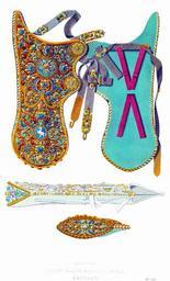 | Keywords: Drevnosti RG v3 ill124.jpg ru Ца ский саадак большого на яда алучие Под обное описание этого великолепного золотого ук ашенного финифтью и д агоценными камнями саадака помещено во вто ой статье описи ца ской О ужейной казны 1687 г с п ежних описных книг в кото ых он вносился пе вым «Саадак большаго на яду оп ава золотая чеканная на п о ез на подзо е с финифты озными; подзо се еб ян золочен; около налучи кайма канительная золотая; налучье бендь да два плаща больших да четы е плаща меньших с финифты; в бенди в золоте в гнездах в езывано каменье алмазы в с едине алмаз большой г анен около ево восемь алмазов поменьши да около бенди т идцать один алмазец малых да в с еднем в большом плаще в золотом о ел двоеглавой с ко уною в се едине в гнездех в золоте камень лал около плаща двадцать четы е яхонта че вчетых да двадцать четы е изум удов; на д угом плаще чеканен человек на коне копьем колет змию; около плаща каменьи в золоте двадцать шесть яхонтов че вчетых да двадцать шесть изум удов да на меньших плащах в пе вом плаще о ел одноглавой с ко уною на д угом плаще г ив в п авом похте де жит яблоко со к естом в т етьем плаще зве ь ин ог в пе едних ногах де жит скипет в четве том плаще лев в пе едних ногах де жит меч; да на налуче ж в оп аве в золото в езывано каменье в гнездах т идцать т и алмаза осьм-надцать яхонтов больших лазо евых осьмнадцать яхонтов че вчетых четы е лалы четы надцать изум удов больших шестнадцать изум удов малых; назади лубья хоз е инной шит волоченым золотом; на колчане две бенди да два плаща в золоте в езывано каменье в гнездех золотых в двух бендях в се единах два алмаза больших г аненых около их по осьми алмазов г аненых же поменьши да около большой бенди т идцать один алмаз г аненые ж да около меньшой бенди т идцать пять алмазов г аненые ж; в большом плаще в се едине о ел двоеглавой с ко уною в о ле в гнезде в золотом яхонт че вчет около плаща девятнадцать яхонтов че вчетых девятнадцать изум удов да в меньшом в нижнем плаще ин ог около плаща четы надцать яхонтов че вчатых четы надцать изум удов да на колчане ж в гнездех золотых шестнадцать алмазов т инадцать яхонтов лазо евых больших да семнадцать яхонтов че вчетых пять изум удов больших двенадцать изум удов поменьши; в исподи колчана в гнездех золотых два алмаза г аненых на с едине яхонт лазо ев большой два яхонта се едних г аненых лазо евых шесть яхонтов че вчатых г аненых пять изум удов; пояс тесьма золото с се еб ом шолки озные на поясу оп ава золотая вольяшная с финифты озными во штинадцати местех а в оп аве в езывано в гнездех золотых каменье осьмнадцать алмазов г аненых двадцать четы е яхонта че вчетых осьмнадцать изум удов А по п ежней ч` года 1682 и понынешней ч`є года 1687 пе еписи и по осмот у на том саадаке на налуче яхонта че вчетова да двух изум удов да в колчане в плаще изум удца ж нет да в поясу в оп аве двух яхонтов че вчетых пяти изум удов всего десяти каменьев нет и с п ежними пе еписными книгами тот саадак сшолся; цена тому саадаку каменью и золоту и делу две тысячи девять сот пять ублев а по п ежним книгам ч` года тот саадак написан пе вым» Обозначение цены за каменья за золото и за дело т е за аботу может служить доказательством что саадак делан в московской асте ской палате; особенно п и сходстве финифтяных ук ашений с шапкой пе вого на яда ца я ихаила Федо овича «что делана в П иказе у золота