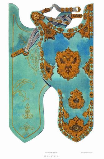 | Keywords: Drevnosti RG v3 ill127.jpg ru алучие Этот саадак ис 127 и 128 из набивной кожи я инного цвета ук ашен золотыми езными плащами с че нью и в нескольких местах д агоценными камнями а с еднем большом плаще налучия по вы ажению описей «Печать Ца ства осковскаго» двуглавый о ел с московским ге бом на г уди а колчане такая же печать в меньшем азме е и све х того ниже ге ба плащ на кото ом вы езан г иф с ко оной на главе Описание этого саадака в описной книге 1687 г следующее «Саадак большаго ж на яду хоз е инной оп ава золотая езная с че нью; в налуче бенд1 и в ней в гнезде в золоте камень алмаз г аненой да изум уд г аненой в гнезде ж золотом двадцать семь яхонтов че вчатых малых а около налучи кайма т идцать пять плащей золотых в них езаны клейма с че нью а меж плащами т идцать четы е епья с че нью один епей попо чен; в оп аве на налуче два наугольника золоты езные с че нью а в них две мишени больших езаны с че нью да меж наугольника вве ху половина клейма и мишени езаны с че нью на се едине плащ большой клеймо золото езано с че нью о ел двоеглавой с ко оною; се еди о ла сидит человек на коне колет змия; по сто онам по полуклейма с мишеньми золоты езаны с че нью; в д угом плаще клеймо в нем мишень в золоте езано с че нью; в исподнем плаще в наконешнике клеймо в клейме мишень большая в золоте сп а езаны с че нью; в колчане оп авы две бенди золоты езаны с че нью а в них два алмаза в гнездех золотых г анены да два изум уда да около алмазов и изум удов по двадцати по семи яхонтов че вчетых; на колчане чепь золотая с финифты озными на чепи пять плащей золотых с финифты в них в езывано каменье пять яхонтов че вчатых; на концах у чепи два епья в них в золоте в езывано два яхонта че вчатых в гнездех а около их по девяти яхонтиков че вчатых; около колчана кайма в ней пятнадцать плащей золотых а в них по мишенце в езывано в золото с че нью меж ними семнадцать епьев золотых с че нью; вве ху под чепью наугольник в золоте в езано клеймо в клейме мишень вве ху ж половина клейма а в нем половина мишени в золоте езано с че нью; да в плаще большом в клейме о ел двоеглавой на об ез с ко уною а в нем сидит человек на коне колет змия езан с че нью а над клеймом плащик с ко уною около ево два епья золоты езаны с че нью; под тем плащем клеймо в нем г ив езан в золоте с че нью да на исподи плащ большой клеймо а в нем мишень большая в золоте езано с че нью; на исподи донцо шитое волоченым золотом назади сафьян че вчат; помочь шолк че вчат с золотом; пояс тесма шолки озные се еб о с золотом на поясу оп ава в семнадцати местех золото езано с че нью А по нынешней пе еписи ч`є года 1687 и по осмот у тот саадак п отив п ежних пе еписных книг сошолся; на налуче в клейме и в колчане плащей и епьев золотых девяти мест нет да на колчане в чепи двух яхонтиков нет да све х п ежних пе еписных книг ч` года 1682 по нынешней пе еписи в налуче двух епьев да яхонтика нет; цена тому саадаку каменью и золоту и делу семь сот пятьдесят ублев а по п ежним книгам ч` года тот саадак написан вто ым» Д евности Российского госуда ства http //john-petrov livejournal com/1190678 html Солнцев Фёдо Г иго ьевич < 1853 PD-old Antiquities of Russian country - Volume III Files uploaded by Shakko from various sources Tsars' saadak |