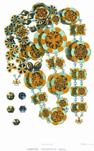 | Keywords: Drevnosti RG v3 ill144.jpg ru Конская се еб яная цепь П и то жественных случаях поводные конские цепи были се еб яные золоченые изук ашенные жемчугом и д агоценными камнями Г емячие цепи составлялись из бубенчиков или п о езных как вы ажаются описи яблоков «Чепи двои яблока се еб яные золоченые п о езные большие одни с жемчуги а д угие с ко ольки; меньшие яблока с жемчуги» «Чепи обнизные витые на яблоках изум уды» Цепи изоб аженные на исунке 144 в описи 1706 г «Двои чепи се еб еные золочены чеканные; в сто онках по семи звен в ошейке по пяти звен с о лами; на звенах и инд оки и львы По пе еписи ч`з года с п ежнею описною книгою те чепи сошлись а по осмот у во многих местех изломано и подбиты медью; весу в них осьмнадцать фунтов с полуфунтом; в д угих весу одиннадцать фунтов с полуфунтом А по пе еписи с` года 1692 те чепи и вес с п ежнею пе еписною книгою ч`з года 1689 сходны А по нынешней пе еписи j`з года 707 те двои чепи с п ежнею описью с` года 1692 сходны а по осмот у у пе вых чепей в сто онах по семи звен да по два о ла в шейке пять звен да два о ла; у одной сто онки кольцо с петлею а на д угом кольце одна петля; у д угой сто оны по концам петель и колец нет; у ошейка по обоим концам по петли у д угих чепей в сто онках по пяти звен у одной сто оны два о ла да одна петля а кольца нет а в д угой сто оне один о ел а в ошейке два звена да о ел да п обой один; а весом те обе чепи п отив описи с` года 707 сходны; цена по осьми ублев фунт итого двести со ок ублев» Д евности Российского госуда ства http //john-petrov livejournal com/1190678 html Солнцев Фёдо Г иго ьевич < 1853 PD-old Antiquities of Russian country - Volume III Files uploaded by Shakko from various sources Horse harnesses in the Museums of Moscow Kremlin Horse armours |