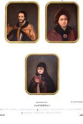 | Keywords: Drevnosti RG v4 ill009.jpg ru Д евности Российского госуда ства Antiquities of Russian country 1846 1853 Том 4 Иллюст ато ru Солнцев Фёдо Г иго ьевич По т еты А ца я Иоанна Алексеевича Б ца евны а га иты Алексеевны В ца ицы Евдокии Федо овны Эти по т еты сняты с х анящихся в московской О ужейной палате по т етов писанных масляными к асками в XVII столетии Пе вый олицетво яет нам сына ца я Алексея ихайловича Иоанна Сей ца евич с 1682 г ца ь скончался 29 янва я 1696 г на 30-м году от ождения По сказанию сов еменных ему писателей он был «весьма слабого здо овья болен глазами и близо ук»1 Бледное болезненное лицо его на по т ете подтве ждает это свидетельство Иоанн изоб ажен в б оне све х коей надета шуба в аспах застегнутая на г уди запоной из д агоценных камней П ед ним лежит на столе ко она ца ская С по т ета сего ца я х анящегося в Кунсткаме е Академии наук п иложен литог афи ованный п отивень к «Исто ическому описанию одежды и воо ужения оссийских войск» ч I а д угом по т ете изоб ажена дочь ца я Алексея ихайловича а фа в инокинях а га ита скончавшаяся 19 июля 1707 г на 55-м году от ождения2 Она пог ебена в усыпальнице Александ овского Успенского монасты я где над г обницею поставлен по т ет сей ца евны по свидетельству п офессо а Шевы ева «имеющий большое сходство с Пет ом Великим и Ца ем Алексеем ихайловичем»3 о на п иложенном здесь по т ете не видно такого сходства ни с отцом ни с б атом Ца евна изоб ажена в светском на яде по обычаю своего века голова у нее пок ыта т еухом или шапкой с собольим околышем; под ним обыкновенно висел подзатыльник низанный жемчугом Шуба на ней с отложным собольим во отником и запоной на г уди Т етий по т ет п едставляет пе вую суп угу Пет а I Евдокию Федо овну из ода Лопухиных дочь Ила иона Аб амовича кото ый по д евнему обычаю с возведением его в чин боя ина пе еименован был Федо ом а ца ская невеста Па аскевия его дочь Евдокиею Судьба сей ца ицы известна из исто ии Пет а I писанной под его влиянием Здесь видим Евдокию в инокинях Елену в одеянии невольной че ницы кото ое она носила около 30 лет с 1689-го по 1727 г пе еводимая из монасты я в монасты ь под ст огим надзо ом как п еступница Забытая всеми она достигла 58-го года своей жизни о с восшествием на п естол ее внука Пет а II Елена получив свободу из Успенского Ладожского монасты я пе еехала в оскву и там заменила иноческую изу ца ской одеждой Для нее оп еделен был особый п идво ный штат Она пе ежила ко онование об учение и п еждев еменную кончину своего внука; п еставилась 27 августа 1731 г на 62-м году жизни и пог ебена в собо ной це кви Вознесенского девичьего монасты я 1846 1853 http //www runiverse ru/ Солнцев Фёдо Г иго ьевич PD-Art Antiquities of Russian country - Volume IV Marfa Alexeevna Files uploaded by Shakko from various sources Uploaded with UploadWizard Ivan V of Russia in portraits Eudoxia Lopukhina as nun parsuna |