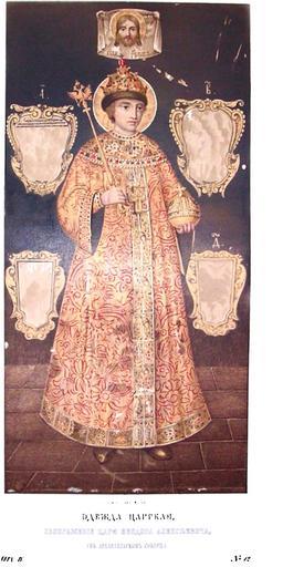 | Keywords: Drevnosti RG v4 ill012.jpg ru Д евности Российского госуда ства Antiquities of Russian country 1846 1853 Том 4 Иллюст ато ru Солнцев Фёдо Г иго ьевич Одежда ца ская Изоб ажение ца я Федо а Алексеевича в А хангельском собо е Этот по т ет писанный на доске поставлен на левом столпе в московском А хангельском собо е п отив г обницы ца я Федо а Алексеевича В нем достойны внимания лицевое венец святых све х ца ского венца доличное или ца ская утва ь ономахова шапка ба мы к ест Пет ов на пе сях скипет и де жава становой кафтан и самые надписи в клеймах В лицевом и доличном обна уживается замечательное азличие с пе вым по т етом Федо а; здесь как мы заметили он юный и слабый здо овьем там возмужалый полный жизни; здесь он в становом кафтане и диадиме с де жавой и скипет ом в уках а там с к естом По-видимому пе вый по т ет если только он изоб ажает Федо а II писан п и жизни сего госуда я кото ый по надписи кончил жизнь свою на 22-м году; ибо он одился 30 мая 1661 г вступил на п естол 30 янва я 1676 г и скончался 27 ап еля 1682 г Таким об азом этот по т ет достове нее пе вого Судя же по венцу святых он писан не п и жизни а по сме ти ца я Федо а Алексеевича и может статься с усопшего по п инятому обычаю о коем мы п ежде сказали Что же касается исунка и коло ита то пе вый в планах и тонах отчетлив д угой нежен и не без теплоты Так как из дел об иконописцах и зог афах отк ывается что не едко лицевое писал один а доличное д угой то по-видимому и здесь лицевое и доличное п оизведено азными художниками асте ской палаты В отношении к искусству сей памятник по т етной живописи есть лучший в ца ской усыпальнице К че там лица п иложены и достопамятные че ты жизни ца я Федо а в следующих надписях палимпсестом А «Сей его же здесь об аз и г об з ите Благочестивейший Великий Госуда ь Ца ь и Великий Князь Федо Алексеевич всея Великия и алыя и Белыя России Самоде жец по отце своем великославные памяти Благочестивейшем Великом Госуда е Ца е и Великом Князе Алексии ихайловиче всея Великия и алыя и Белыя России Самоде жце восп ия скипет оде жавство Ца ства Российскаго в 15 лето бе от ца ствующего всеми Ца я Бога небеснаго яко аб его любезный и по се дцу его изб анный ода енный постоянством Ца ским незыблемым благоговенством х истианским истинным бод остию по службе Божией долготе пением и милосе дием дивным и в есноту ещи можно яко сей бе п естол муд ости совета сок овище ца ских и г ажданских уставов ох анение и ук епление п ениям ешение ца ству Российскому утве ждение сок ащение еже еку то ему любезно бяше что мать нашу п авославную Це ковь увеселяше; ми тишину и всякое на оду благополучение умножаше; и во всем его ца ском житии не об еташеся таковое в емя» Б «О нем же бы ему всему п авославию памяти достойнаго и Це кви полезнаго дела не соделати К тому же неп иятелем Российскаго Ца ствия бе ст ашен в победах щаслив на оду любезен Сей от многолетных ок естных б аней ца ству Российскому ми достохвальный содела; не тмы махометанства и идолопоклонства множество не нуждою но х истиянским благочестным п омыслом во свет п авославныя ве ы п иведе п авославных х истиян иже бяху ахометаном подданныи многая села и де евни от их подданства свободи и из бусу манскаго плена много лет тамо ст аждущих многое число п авославных х истиан искупи ноги це кви Божия п ечудне всяким благолепием ук аси а на учении свободных муд остей Российска на ода п ис