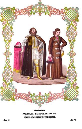 | Keywords: Drevnosti RG v4 ill014.jpg ru Д евности Российского госуда ства Antiquities of Russian country 1846 1853 Том 4 Иллюст ато ru Солнцев Фёдо Г иго ьевич Одежда боя ская XVII в По т еты князей Репниных Здесь видим снимки с подлинных по т етов князей Репниных боя ина Бо иса Александ овича и Пет а Александ овича воеводы овго одского в их на яде Академик Солнцев заимствовал изоб ажение их костюма из Олеа иева «Путешествия» а боя ине зипун застегнутый пуговицами; на поясе сабля Све х исподницы надеты желтые сапоги у колен подвязанные Све х зипуна шуба ту ецкая с отложным во отником с золотыми петлицами и откидными укавами Д угой в кафтане с петлицами и п о ехой или аз езом на поле В одной уке у него шапка в д угой ши инка Хотя на исунке в «Исто ическом описании одежды и воо ужения Российских войск» ис 10 этот кафтан назван охобнем но последний был ши е и длиннее пе вого имел п о ехи под укавами и четы ехугольный откидной во отник В ца ствование Федо а Алексеевича восп ещено было в охобнях впускать во дво ец и даже в К емль Кафтан составлял упот ебительнейшую одежду в допет овской России «Знатные» по словам Ка лейля «носят кафтаны кои п ости аются до колен и застегиваются напе еди пуговицами с петлицами» Сзади кафтана п истегивался высокий стоячий во отник известный под именем козы я кото ый не едко ук ашался золотым и се еб яным шитьем по ба хату и алтасу жемчугом и до огими каменьями; отсюда и на одное вы ажение «ходить козы ем» т е важничать щеголять Как фе ези так и кафтаны были азных одов по их назначению и п оисхождению ве хние и исподние становые и ездовые сми ные или т ау ные и дождевые ту ские есские кизылбашские и че кесские усского пок оя а сию одежду упот еблялись ткани из шелка и бумаги также сукна 1846 1853 http //www runiverse ru/ Солнцев Фёдо Г иго ьевич PD-Art Antiquities of Russian country - Volume IV Russian boyars Files uploaded by Shakko from various sources Uploaded with UploadWizard Parsuna portraits of Repnin brothers |
