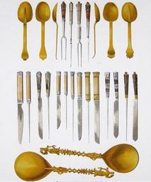 Keywords: Drevnosti RG v5 ill 058a - Royal cutlery.jpg Knives and forks from the Russian royal household scan 1849-53 Fyodor Solntsev 1801-92 PD-art-100 Antiquities of Russian country - Volume V Forks in art Knives in art spoons in art Cutlery