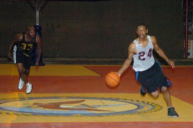 | Keywords: Dribbling down court DVIDS164627.jpg en Tech Sgt Rodney Hicks dribbles down the court during a basketball game organized by service members at Combined Joint Task Force - Horn of Africa April 10 2009 Sailors from USS Leyte Gulf visited Camp Lemonier during a scheduled port call in Djibouti The USS Leyte Gulf currently at sea to the Gulf of Aden conducted training exercises with the Djiboutian Navy while in port 2009-04-10 Petty Officer 2nd Class Kelly Ontiveros https //www dvidshub net/image/164627 090410-N-+++++-412 2009-04-13 03 00 CAMP LEMONNIER DJ PD-USGov-Military-Navy Combined Joint Task Force - Horn of Africa Camp Lemonnier Images from DoD uploaded by Fæ |