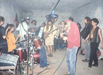 Keywords: Dribdas GurretParty.jpg en Dribdas band performing at underground party on Dong hai hill in Taichung Taiwan about 1994 own Chris Armitage 2008-10-07 Music of Taiwan