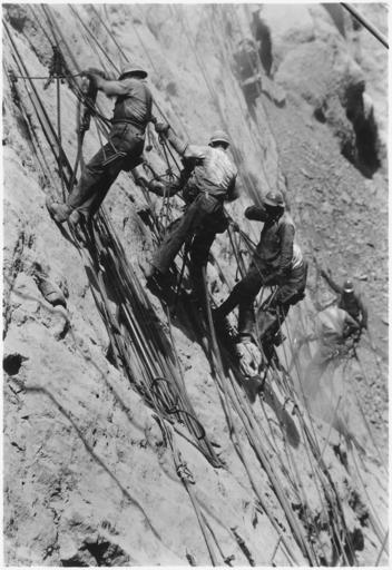 | Keywords: Drillers at work on canyon wall above power plant location - NARA - 293843.jpg Scope and content Photograph from Volume Two of a series of photo albums documenting the construction of Hoover Dam Boulder City Nevada General notes 293843 Local identifier Department of the Interior Bureau of Reclamation Engineering and Research Center 05/18/1981 - 03/04/1988 NARA's Rocky Mountain Region Denver NRGA Building 48 Denver Federal Center West 6th Avenue and Kipling Street Denver CO 80225-0307 1933-04-10 Record group Record Group 115 Records of the Bureau of Reclamation 1889 - 2008 Record group ARC 444 Photograph albums compiled 1903 - 1972 Series ARC 293611 File unit File unit ARC Variant control numbers NAIL Control Number NRG-115-CONSTPHO85006-BC21635 Other versions <gallery> File Drillers at work on canyon wall above power plant location - NARA - 293843 tif tif </gallery> NARA-cooperation PD-USGov Construction workers in the United States 1933 People associated with the construction of Hoover Dam workers high scalers 1933 in the United States |