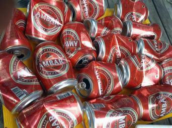 Keywords: drink amber beer cans trash red pick up