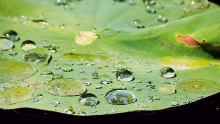 Keywords: drip water structure raindrop transparent beaded run off wet drop of water close leaf water lily nature pond aquatic plant botany plant green