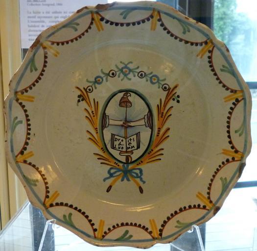 | Keywords: Droits de l'homme assiette.jpg en The decor symbolises the declaration of the human rights on August 26 1789 Subjects are union and liberty The union is represented by the handshake a symbol that was inspired by freemasony over an open book on which we can see the words droit de lhomm misspelled 'human rights' Liberty is represented by a Phrygian cap on an épée own Stanzilla Anonymous ~ 1790 Faience of Nevers on the French Revolution Plates of France 1790 works in France Faience in the Musée des Beaux-Arts de Bernay Cc-zero |