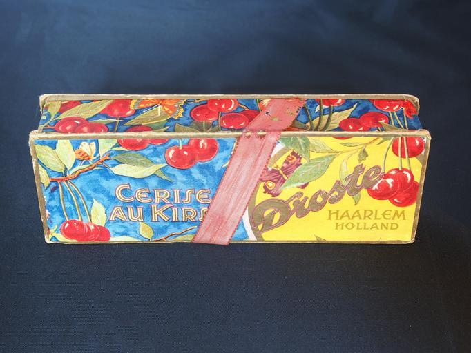 Keywords: Droste Cerises au Kirsch lange smalle doos, foto1.JPG Photographed at a collector of Droste For info see tincollectors nl or email info tincollectors nl own 2013-12-15 14 34 33 Alf van Beem CC-zero Trademarked Droste