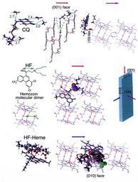 | Keywords: Drug-heme interaction.png en Top row Binding of chloroquine CQ to the 001 and 100 faces of hemozoin HZ Left Electrostatic interactions between CQ and HZ at the 001 face including base-acid N CH2CH3 2-H+ ¦-O2C acceptor-donor ring N ¦H-C H CH- acceptor-donor quinoline Cl ¦H3C- and proton donor-p acceptor exocyclic N-H ¦H2C CH Center CQ intercalated within groove delineated by dashed green line on surface of 001 face viewed edge-on along the a-crystal axis Binding of CQ to the 100 face of HZ Central row Binding of halofantrine HF to the 001 and 010 faces of HZ Left top Molecular structure of HF The double-arrow denotes the separation between the tertiary N and the OH group Left bottom Cyclic heme dimer in crystal structure of HZ where the double-arrow denotes the separation between the propionic acid group and the Fe carboxylate carbonyl group Center binding of HF to the 001 face of HZ viewed face-on HF is too bulky to be intercalated within a groove on the 001 face as is CQ Nevertheless HF forms strong interactions with the 001 surface; the OH group of HF is hydrogen bonded to the Fe-carboxylate carbonyl O atom and the tertiary N-H+ group is H-bonded to the CO2- group of HZ Note HF can bind to the 100 face of HZ in an arrangement akin to that of CQ to the 100 face of HZ see top row right Bottom row Binding of HF-heme coordination complex to the 010 face of hemozoin Left Molecular structure of the HF-ferriprotoporphyrin IX coordination complex K A de Villiers H M Marques T J Egan J Inorg Biochem 2008 102 1660 Right Binding of the HF-Heme complex to the 010 face of hemozoin where the HF moiety of the complex emerges from the crystal face The 010 face is viewed edge-on along the c-axis Note that the quinoline methanols such as quinine and mefloquine also form coordination complexes with ferriproto-porphyrin IX according to Egan and coworkers Thus such quinoline-heme complexes can also be adsorbed onto the 010 face Note that the red violet and blue arrows drawn above the drug-hemozoin arrangements and on the crystal faces shown in central row right designate attachment of the particular antimalarial drug to the 001 100 and 010 faces respectively and subsequent inhibition Original work by Leslie Leiserowitz and Isabelle Weissbuch Leslie Leiserowitz and Isabelle Weissbuch PermissionOTRS 2009022010051995 Leslie Leiserowitz Chloroquine |