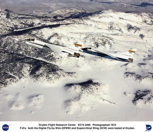 MAKE A MEME View Large Image Dryden F-8 Research Aircraft Fleet 1973 in flight, DFBW and SCW DVIDS697267.jpg en F-8 Digital Fly-By-Wire left and F-8 Supercritical Wing in flight These two aircraft fundamentally changed the nature of aircraft design The F-8 DFBW ...