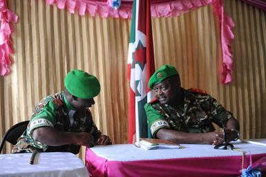 Keywords: AMISOM's Force Commander, General Silas Ntigurirwa, speaks with AMISOM'S outgoing contingent comander, Colonel Habarubira Jean Luc, today at a ceremony to mark the rotation of 78 of his troops back home to Burundi. AMISOM Photo AMISOM's Force Commander, General Silas Ntigurirwa, speaks with AMISOM'S outgoing contingent comander, Colonel Habarubira Jean Luc, today at a ceremony to mark the rotation of 78 of his troops back home to Burundi. AMISOM Photo