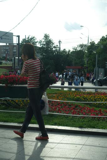 Keywords: girl striped red_and_white redandwhite flower_bed flowerbed flowers shadow blown_highlights blownhighlights people talking outdoor