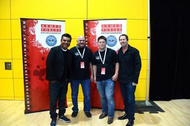 | Keywords: indoor ANSBACH, Germany (May 20, 2015) -- Comedians George Lopez and Bryan Kellen visited U.S. Army Garrison Ansbach for a stand-up comedy show Tuesday at the Katterbach Fitness Center. The show, presented by Armed Forces Entertainment and titled “George Lopez: Grunt by Association,” played to an audience of approximately 1,500 USAG Ansbach community members. Before the show, Lopez and Kellen toured a hangar and the flightline of Katterbach Army Airfield with Soldiers of the 12th Combat Aviation Brigade. After the show, Lopez and Kellen stayed to take photos with fans of the show. (U.S. Army photo by Stephen Baack, USAG Ansbach Public Affairs) ANSBACH, Germany (May 20, 2015) -- Comedians George Lopez and Bryan Kellen visited U.S. Army Garrison Ansbach for a stand-up comedy show Tuesday at the Katterbach Fitness Center. The show, presented by Armed Forces Entertainment and titled “George Lopez: Grunt by Association,” played to an audience of approximately 1,500 USAG Ansbach community members. Before the show, Lopez and Kellen toured a hangar and the flightline of Katterbach Army Airfield with Soldiers of the 12th Combat Aviation Brigade. After the show, Lopez and Kellen stayed to take photos with fans of the show. (U.S. Army photo by Stephen Baack, USAG Ansbach Public Affairs) |