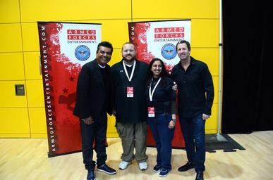 Keywords: indoor ANSBACH, Germany (May 20, 2015) -- Comedians George Lopez and Bryan Kellen visited U.S. Army Garrison Ansbach for a stand-up comedy show Tuesday at the Katterbach Fitness Center. The show, presented by Armed Forces Entertainment and titled “George Lopez: Grunt by Association,” played to an audience of approximately 1,500 USAG Ansbach community members. Before the show, Lopez and Kellen toured a hangar and the flightline of Katterbach Army Airfield with Soldiers of the 12th Combat Aviation Brigade. After the show, Lopez and Kellen stayed to take photos with fans of the show. (U.S. Army photo by Stephen Baack, USAG Ansbach Public Affairs) ANSBACH, Germany (May 20, 2015) -- Comedians George Lopez and Bryan Kellen visited U.S. Army Garrison Ansbach for a stand-up comedy show Tuesday at the Katterbach Fitness Center. The show, presented by Armed Forces Entertainment and titled “George Lopez: Grunt by Association,” played to an audience of approximately 1,500 USAG Ansbach community members. Before the show, Lopez and Kellen toured a hangar and the flightline of Katterbach Army Airfield with Soldiers of the 12th Combat Aviation Brigade. After the show, Lopez and Kellen stayed to take photos with fans of the show. (U.S. Army photo by Stephen Baack, USAG Ansbach Public Affairs)