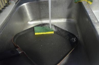 Keywords: pan pans sponge cleaning dish dishes water chore sink clean soap spray dirty housekeeping