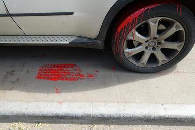 Keywords: red paint wheel bmw sidewalk wet_paint wetpaint tire rim vehicle car