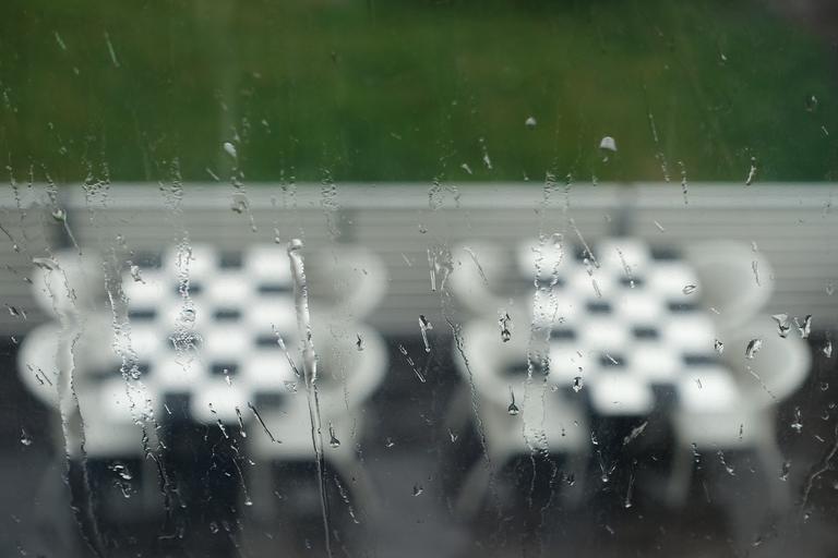 Keywords: unfocused rain window glass tables grass restuarant chequered