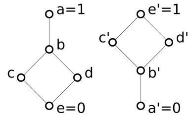 Keywords: Duale Verbaende.svg de Zwei zueinander duale Verbände die nicht isomorph sind dual to each other but not isomorphic own Mini-floh 2013-02-23 Cc-zero Hasse diagrams Lattice theory