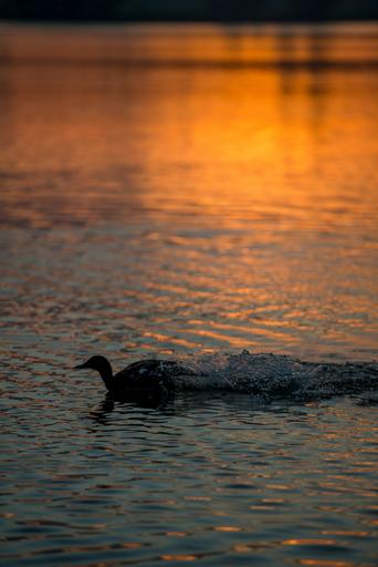 Keywords: duck bird water flying wings feathers silhouette splash sunrise morning