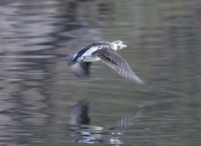 | Keywords: outdoor animal bird water aquatic bird When first posted I had thought that this bird was an adult male. Doing more research, I now feel that it was a HY male in "supplemental 1" plumage or there-about. Primary reason being the amount of brown in the face and flanks and breast. I think that in an adult male in molt that the mix would be black and white, not brown and white. And although the bill of an adult male might be all gray at this time of year, I think that this is more likely of an imm bird. The following is copied from NA Birds: "Alternate I Plumage Prealternate I molt begins in Oct and continues to mid-Dec. Timing known only for male, assumed to be similar for female (Palmer 1976). Partial molt; Juvenal wing and Basic I tail and belly retained. Male. A less well-defined version of Definitive Alternate male plumage. Gray patch around eye more brown and less well defined, loral-patch dark brown (not black). Breast has smaller and less crisp black band than in Definitive Alternate. Back a mixture of black and white feathers; scapulars gray to white. Sides and flanks light gray, belly white." Robertson, Gregory J. and Jean-Pierre L. Savard. 2002. Long-tailed Duck (Clangula hyemalis), The Birds of North America Online (A. Poole, Ed.). Ithaca: Cornell Lab of Ornithology; Retrieved from the Birds of North America Online: bna.birds.cornell.edu/bna/species/651 doi:10.2173/bna.651 When first posted I had thought that this bird was an adult male. Doing more research, I now feel that it was a HY male in "supplemental 1" plumage or there-about. Primary reason being the amount of brown in the face and flanks and breast. I think that in an adult male in molt that the mix would be black and white, not brown and white. And although the bill of an adult male might be all gray at this time of year, I think that this is more likely of an imm bird. The following is copied from NA Birds: "Alternate I Plumage Prealternate I molt begins in Oct and continues to mid-Dec. Timing known only for male, assumed to be similar for female (Palmer 1976). Partial molt; Juvenal wing and Basic I tail and belly retained. Male. A less well-defined version of Definitive Alternate male plumage. Gray patch around eye more brown and less well defined, loral-patch dark brown (not black). Breast has smaller and less crisp black band than in Definitive Alternate. Back a mixture of black and white feathers; scapulars gray to white. Sides and flanks light gray, belly white." Robertson, Gregory J. and Jean-Pierre L. Savard. 2002. Long-tailed Duck (Clangula hyemalis), The Birds of North America Online (A. Poole, Ed.). Ithaca: Cornell Lab of Ornithology; Retrieved from the Birds of North America Online: bna.birds.cornell.edu/bna/species/651 doi:10.2173/bna.651 |