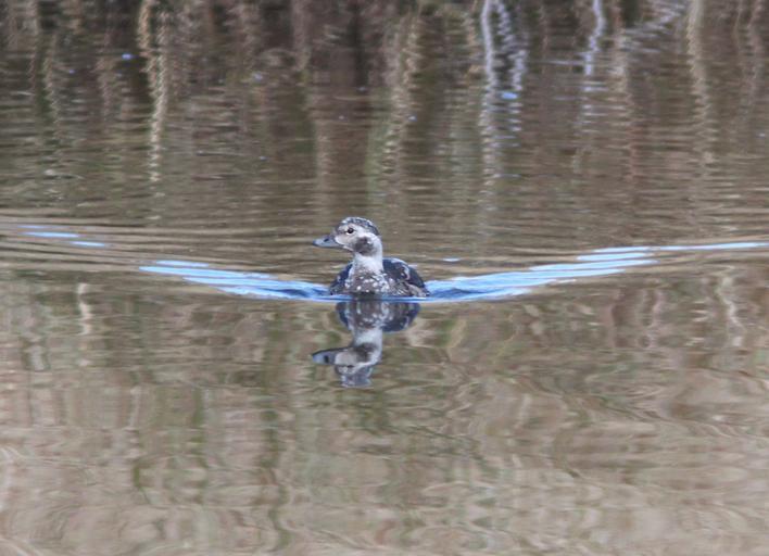 Keywords: outdoor When first posted I had thought that this bird was an adult male. Doing more research, I now feel that it was a HY male in "supplemental 1" plumage or there-about. Primary reason being the amount of brown in the face and flanks and breast. I think that in an adult male in molt that the mix would be black and white, not brown and white. And although the bill of an adult male might be all gray at this time of year, I think that this is more likely of an imm bird. The following is copied from NA Birds: "Alternate I Plumage Prealternate I molt begins in Oct and continues to mid-Dec. Timing known only for male, assumed to be similar for female (Palmer 1976). Partial molt; Juvenal wing and Basic I tail and belly retained. Male. A less well-defined version of Definitive Alternate male plumage. Gray patch around eye more brown and less well defined, loral-patch dark brown (not black). Breast has smaller and less crisp black band than in Definitive Alternate. Back a mixture of black and white feathers; scapulars gray to white. Sides and flanks light gray, belly white." Robertson, Gregory J. and Jean-Pierre L. Savard. 2002. Long-tailed Duck (Clangula hyemalis), The Birds of North America Online (A. Poole, Ed.). Ithaca: Cornell Lab of Ornithology; Retrieved from the Birds of North America Online: bna.birds.cornell.edu/bna/species/651 doi:10.2173/bna.651 When first posted I had thought that this bird was an adult male. Doing more research, I now feel that it was a HY male in "supplemental 1" plumage or there-about. Primary reason being the amount of brown in the face and flanks and breast. I think that in an adult male in molt that the mix would be black and white, not brown and white. And although the bill of an adult male might be all gray at this time of year, I think that this is more likely of an imm bird. The following is copied from NA Birds: "Alternate I Plumage Prealternate I molt begins in Oct and continues to mid-Dec. Timing known only for male, assumed to be similar for female (Palmer 1976). Partial molt; Juvenal wing and Basic I tail and belly retained. Male. A less well-defined version of Definitive Alternate male plumage. Gray patch around eye more brown and less well defined, loral-patch dark brown (not black). Breast has smaller and less crisp black band than in Definitive Alternate. Back a mixture of black and white feathers; scapulars gray to white. Sides and flanks light gray, belly white." Robertson, Gregory J. and Jean-Pierre L. Savard. 2002. Long-tailed Duck (Clangula hyemalis), The Birds of North America Online (A. Poole, Ed.). Ithaca: Cornell Lab of Ornithology; Retrieved from the Birds of North America Online: bna.birds.cornell.edu/bna/species/651 doi:10.2173/bna.651