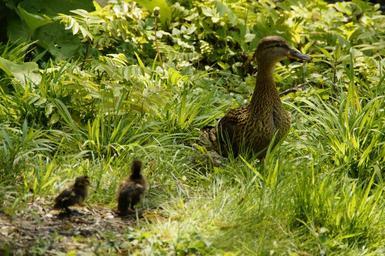 Keywords: duck mallard female chicks bird water bird waterfowl bank embankment