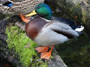 Keywords: duck mallard tree trunk water bird animal world plumage color ducks