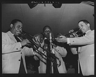 | Keywords: Duke Ellington - Hurricane Ballroom - trio.jpg Duke Ellington's orchestra during the early morning broadcast fr De gauche à droite Joe Tricky Sam Nanton trombone Harry Carney clarinette et Wallace Jones trompette Library of Congress Prints and Photographs Division Farm Security Administration - Office of War Information Photograph Collection http //hdl loc gov/loc pnp/fsa 8d13203 1943-04 Gordon Parks Farm Security Administration PD http //www loc gov/rr/print/res/268_parks html LOC-image fsa 8d13203 PD-USGov Duke Ellington Black and white photographs of musicians People with microphones Fashion in 1943 Music in 1943 Jazz ensembles Harry Carney ImageNote 1 11 52 507 382 560 453 2 Joe Tricky Sam Nanton - trombone Harry Carney - clarinet Wallace Jones - trumpet ImageNoteEnd 1 Wallace_Jones jazz musician Photographs by Gordon Parks |