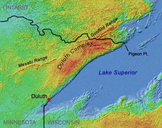 | Keywords: Duluthcomplexmap.png http //www geo umn edu/mgs/srtm_15in jpg Shaded-relief image of northeast Minnesota and adjoining areas in central North America 90 meter grid Shuttle Radar Topography Mission SRTM of http //www2 jpl nasa gov/srtm/ NASA Jet Propulsion Laboratory republished by University of Minnesota Department of Geology and Geophysics The crescent-shaped region north of Lake Superior between Duluth and Pigeon Point is the Duluth Complex Original image has been cropped labels were added and state borders have been emphasized PD-USGov Geology of Minnesota Maps of Lake Superior Geological maps of North America |