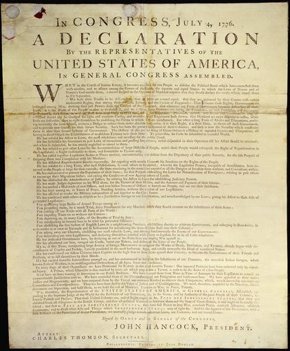 | Keywords: Dunlap Broadside (Declaration of Independence) WDL2716.png Artwork ru Джеффе сон Томас 1743-1826 fr Jefferson Thomas 1743-1826 en Jefferson Thomas 1743-1826 zh 斐 托马斯 1743-1826 pt Jefferson Thomas 1743-1826 ar جيفيرسون توماس 1743-1826 es Jefferson Thomas 1743-1826 ru Плакат Данлепа Декла ация независимости fr Dunlap Broadside Déclaration d'indépendance en Dunlap Broadside Declaration of Independence zh 当列普单 印刷版独立宣 pt Dunlap Broadside Declaração da Independência ar متسعة دونلاب إعلان الاستقلال ru Джон Данлэп официальный типог аф Континентального Конг есса изготовил пе вые печатные экземпля ы аме иканской Декла ации независимости в своей масте ской в Филадельфии ночью 4 июля 1776 года После п инятия Конг ессом Декла ация анее в тот же день п едставители комитета отнесли укописный документ ве оятно чистовой экземпля Томаса Джеффе сона Данлэпу кото ый должен был его отпечатать Ут ом 5 июля копии документа были азосланы членами Конг есса азличным ассамблеям соб аниям и комитетам по безопасности а также командующим континентальных войск 5 июля экземпля печатной ве сии п инятой Декла ации был включен в записи п отокола заседаний Континентального Конг есса за 4 июля Под текстом Декла ации п иведено следующее Подписано по аспо яжению и от лица Конг есса Джоном Хэнкоком п езидентом Засвидетельствовано Ча льзом Томсоном сек ета ем е известно точное количество экземпля ов листовок Данлэпа как их стали называть кото ые были отпечатаны ночью 4 июля Известно что сох анилось двадцать пять экземпля ов документа 20 из них п инадлежат и х анятся в аме иканских уч еждениях два экземпля а в уч еждениях Великоб итании и т и экземпля а х анятся в частных коллекциях Здесь п едставлен экземпля х анящийся в Уп авлении национальных а хивов и учетных документов США <br>Автономия; Плакаты; Политика и уп авление; Соединенные Штаты - Декла ация независимости fr John Dunlap imprimeur officiel du Congrès Continental produisit les premières versions imprimées de la Déclaration d'indépendance américaine dans son atelier de Philadelphie dans la nuit du 4 juillet 1776 Après que la Déclaration eut été adoptée par le Congrès plus tôt dans la journée un comité apporta à Dunlap pour impression le document manuscrit peut-être la bonne copie du brouillon de Thomas Jefferson Le matin du 5 juillet des copies furent envoyées par des membres du Congrès à diverses assemblées conventions et comités de salut public ainsi qu'aux commandants des troupes continentales Toujours le 5 juillet une copie de la version imprimée de la Déclaration approuvée fut insérée dans le journal brut du Congrès continental du 4 juillet Le texte était suivi des mots Signé sur ordre et au nom du Congrès John Hancock Président Attesté Charles Thomson Secrétaire On ne sait pas combien d'exemplaires de ce qui fut appelé la feuille Dunlap ont été imprimés dans la nuit du 4 juillet On sait que vingt-cinq exemplaires existent 20 sont détenus par des institutions américaines deux par des institutions britanniques et trois par des personnes privées Est ici montré l'exemplaire provenant des Archives Nationales et Administration des documents NARA <br>Autonomie; Placards; Politique et gouvernement; États-Unis - Déclaration d'indépendance en John Dunlap official printer to the Continental Congress produced the first printed versions of the American Declaration of Independence in his Philadelphia shop on the night of July 4 1776 After the Declaration had been adopted by the Congress earlier that day a committee took the manuscript document possibly Thomas Jefferson's fair copy of his rough draft to Dunlap for printing On the morning of July 5 copies were dispatched by members of Congress to various assemblies conventions and committees of safety as well as to the commanders of Continental troops Also on July 5 a copy of the printed version of the approved Declaration was inserted into the rough journal of the Continental Congress for July 4 The text was followed by the words Signed by Order and in Behalf of the Congress John Hancock President Attest Charles Thomson Secretary It is not known how many copies of what came to be called the Dunlap broadside were printed on the night of the fourth Twenty-five copies are known to exist 20 owned by American institutions two by British institutions and three by private individuals Shown here is a copy from the U S National Archives and Records Administration <br>Autonomy; Broadsides; Politics and government; United States -- Declaration of Independence zh 1776 年 7 4 日,大陆会议的官方印刷商约翰·当列普 其位于费城的店铺中制 了 美国独立宣 的首版印刷版 国会当天早些时 过 美国独立宣 后, 个委员会将宣 的手稿