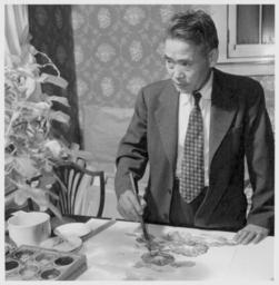 | Keywords: During his spare time, Professor Obata likes to draw and paint for his own pleasure.jpg en During his spare time Professor Obata likes to draw and paint for his own pleasure He can be seen sketching a morning glory taken from his own yard His home is surrounded by plants and trees which he uses as models for his work -- Photographer Iwasaki Hikaru -- Webster Groves Missouri 9/21/44 Volume 50 Section F WRA no I-530 from UC Berkeley Bancroft Library; War Relocation Authority Photographs of Japanese-American Evacuation and Resettlement Series 13 Relocation continued 1944-09-21 http //content cdlib org/ark /13030/ft4m3nb28f/ Online Archive of California Iwasaki Hikaru 1923- Photographer 8464103 other versions PD-USGov Chiura Obata Uploaded with UploadWizard |