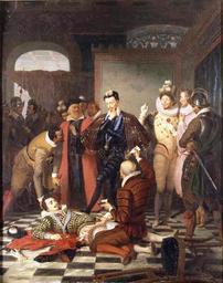 | Keywords: Durupt - Henri III poussant du pied le cadavre du duc de Guise.jpg Artwork Creator Charles Durupt 1804-1838 Henri III poussant du pied le cadavre du duc de Guise oil on canvas cm 91 72 château de Blois Institution Musée du Château Blois http //www photo rmn fr/cf/htm/CSearchZ aspx o Total 7 FP 2782027 E 2K1KTSGRXOMV8 SID 2K1KTSGRXOMV8 New T Pic 2 SubE 2C6NU042KYL4 century 19 Other versions PD-Art Charles Durupt France in history paintings Blois 1588 Château de Blois 1588 Murder in art 1588 Henry I Duke of Guise 1588 Henry III of Poland and France 1588 1588 in France Blois 19th-century oil on canvas paintings in France Paintings in the Château de Blois Images from Réunion des musées nationaux PD-old files by User Jimmy from fr wikipedia People with corpses in art Checkered floors in art |