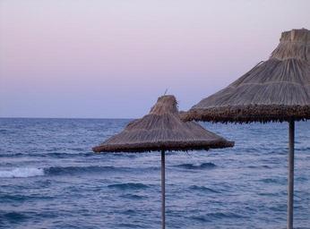 Keywords: dusk sea abendstimmung parasol straw screen crete greece wave