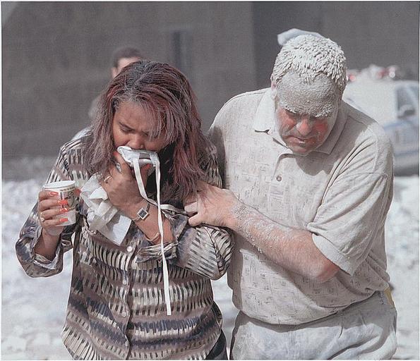 Keywords: Dust covered 911 victims.jpg en Title Man covered with ashes assisting a woman walking and holding a particle mask to her face following the September 11th terrorist attack on the World Trade Center New York City / Don Halasy Creator s Halasy Don photographer Date Created/Published c2001 Medium 1 photograph digital print inkjet color Reproduction Number LC-DIG-ppmsca-01813 digital file from original Rights Advisory No restrictions on publication For information see Don Halasy http //lcweb loc gov/rr/print/res/286_hala html Call Number LOT 13521-8 no 1 P P Repository Library of Congress Prints and Photographs Division Washington D C 20540 USA Notes o Title devised by Library Staff o Signed in pencil o Inkjet digital print made on Epson Professional Media archival matte paper via scan of an original 35mm film negative o Copyright by Don Halasy NY Post o Exhibited Witness and Response September 11 Acquisitions at the Library of Congress 2002 o Unprocessed in PR 13 CN 2002 076 Don Halasy 246 Subjects o World Trade Center New York N Y --Disasters--2000-2010 o September 11 Terrorist Attacks 2001 o Disaster victims--New York State --New York--2000-2010 Format o Inkjet prints--Color--2000-2010 o Photographs--Color--2000-2010 Collections o Miscellaneous Items in High Demand Part of Photographs from Ground Zero World Trade Center Photo Exhibit held at the Bolivar Arellano Gallery New York City Bookmark This Record http //www loc gov/pictures/item/2002716964/ http //lcweb2 loc gov/service/pnp/ppmsca/01800/01813v jpg Don Halasy 09/11/2001 Don Halasy see http //www loc gov/rr/print/res/286_hala html Aftermath of 9/11 in New York City Dust |