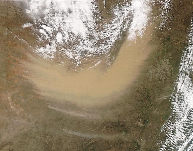 Keywords: Dust Storm over Northern Texas, Image of the Day DVIDS855122.jpg en High winds wreaked havoc across northern Texas on February 24 2007 According toDallas Morning NewsandHouston Chronicle downed power lines left some 37 000 homes and businesses without electricity while gusts up to 100 kilometers 60 miles per hour fueled grass fires and kicked up dust The Moderate Resolution Imaging Spectroradiometer modis gsfc nasa gov MODIS on NASA's aqua nasa gov Aqua satellite took this picture of northern Texas on February 24 2007 This image shows a boomerang-shaped plume of dust sweeping across the state narrowly missing the Dallas metropolitan area to the east Source points for the dust storm appear along the western edge of the plume along with awhere MODIS detected anomalously warm surface temperatures likely from a grass fire Smaller hotspots also appear south of Dallas According to news reports blowing dust reduced visibility to less than a mile in some Texas locations and caused the cancellation of roughly 300 flights at Dallas-Forth Worth International Airport Fires spread by the storm destroyed three homes and forced the evacuation of the Fort Hood army base NASA Identifier ge_07443 2011-07-07 Glenn Research Center https //www dvidshub net/image/855122 855122 2013-02-08 17 59 WASHINGTON D C US PD-USGov Fort Hood Texas Images from DoD uploaded by Fæ |
